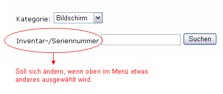 Ich habe folgendes Problem: ich möchte eine Suchfunktion einbauen, bei der der User Kategorie mittels Menü auswählen und den Rechnername bzw. Serien-/Inventarnummer .... in ein weiteres Textfeld eintippen kann.