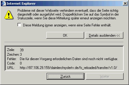 • Im IE wird mir beim Laden der Seite ein Fehler angzeigt. Screenshot anbei. Im FF taucht dieser Fehler allerdings nicht auf. Wie auch immer der IE gibt mir irgendwelceh Zeilen und Zeichen aus, die mir aber mal ueberhaupt nichts sagen.