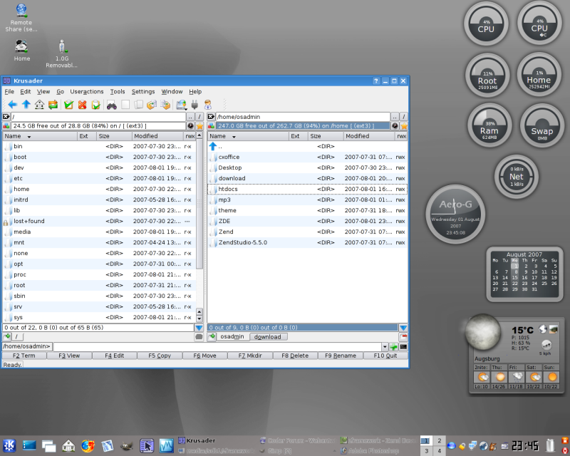 Hier mal 2 Screenshots, rechts kann man die Systemauslastung sehen. Einmal ohne VM und einmal mit. wie man unten auch erkennen kann laufen auch noch nen haufen Programme nebenher (amule, amarok, photoshop, gimp, zendStudio, 2xfilebrowser, emailclient und firefox).