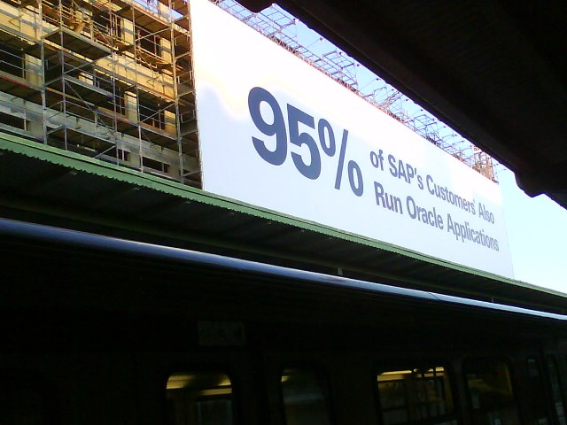 Für Java sehe ich eigentlich keine Gefahr und damit auch keinen Einfluss auf SAP. Ich erinnere mich aber gerade an eine Plakatwerbung die ich mal abfotografiert habe (bild siehe unten). Hier haben sich Oracle und SAP direkt angegriffen. Habe heute gescherzt, dass als nächstes Werbung kommt mit dem Slogan "Selbst die Konkurrenz läuft mit unseren Produkten".