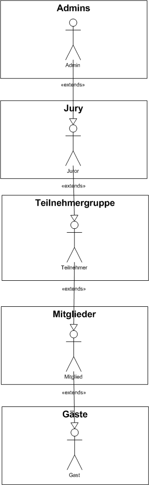 Wenn jmd noch nicht so erfahren mit den ganzen Diagrammen (UML) ist, kann man die Vorgänge (z.B. "Wettbewerb starten", "Juror werden") auch einfach im Wiki schonmal als Klartext runterschreiben.