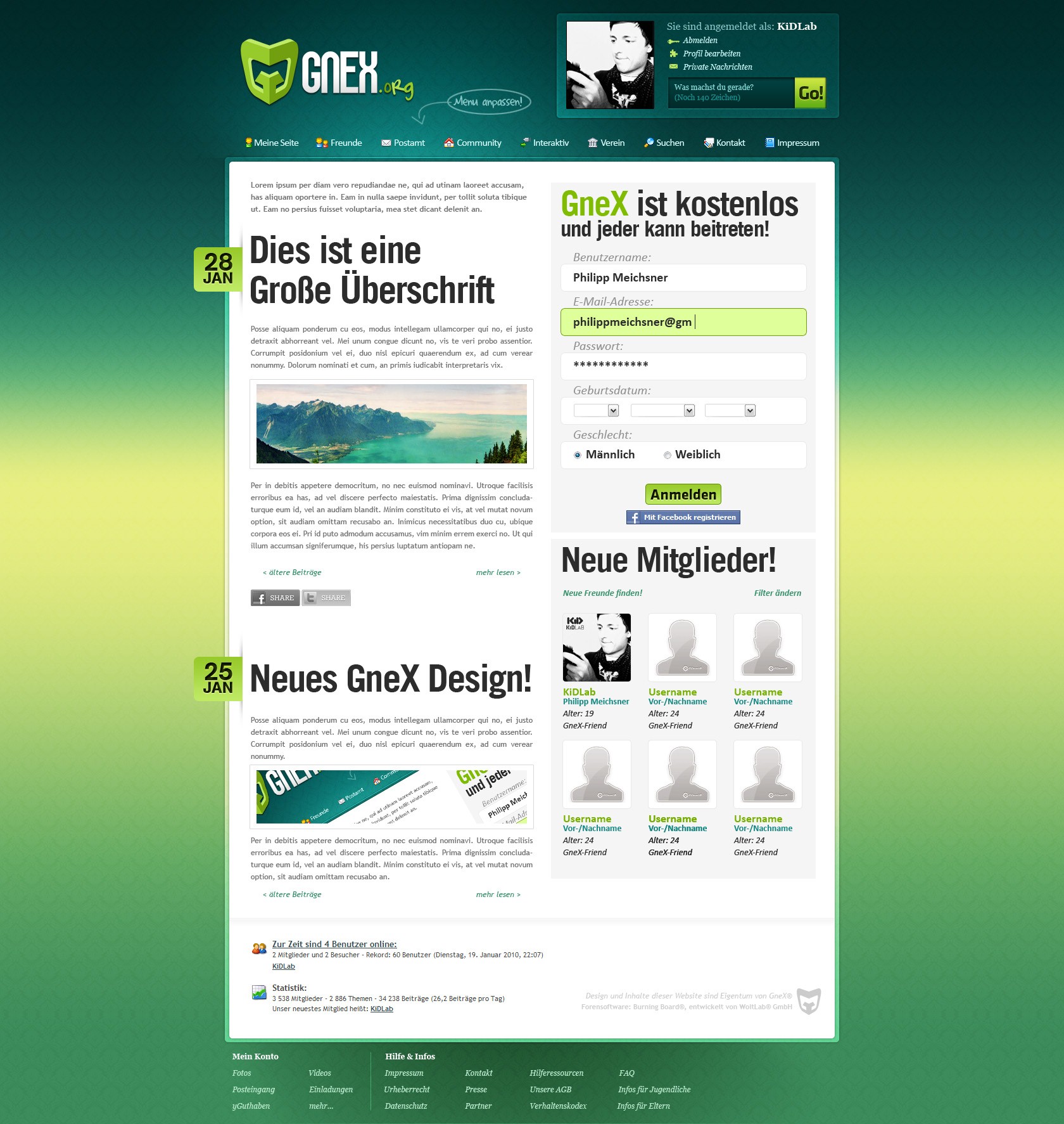Zusätzlich erhält jeder User auf Wunsch seine persönliche "@GneX"-eMail-Adresse, mit der er zum aktiven Bestandteil der GneX-Community wird. Wie jede aktive Gemeinschaft kann auch die GneXGemeinschaft nur funktionieren, wenn sich die Mitglieder kennen.