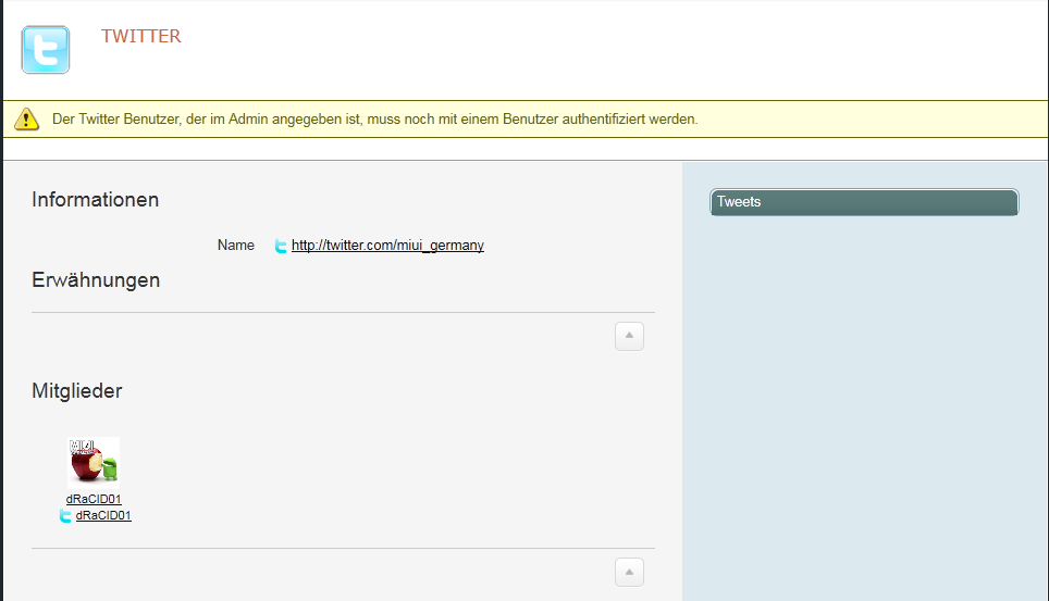 Ich kann mit der Meldung leider nichts anfangen: "Der Twitter Benutzer, der im Admin angegeben ist, muss noch mit einem Benutzer authentifiziert werden." (two-and-a-half-men.de/index.php?page=Twitter)