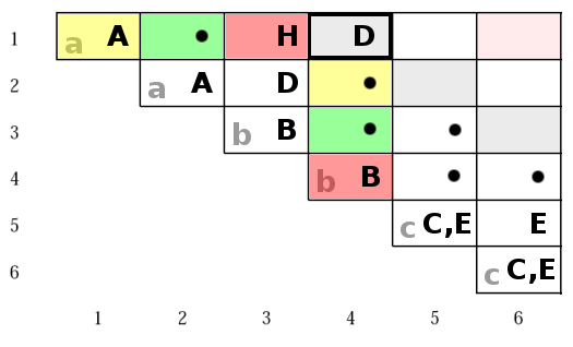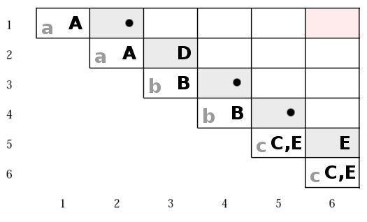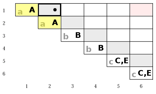 Für Zelle (2,1) betrachten wir also den linken Nachbar (1,1) "A" und den unteren Nachbarn (2,2) "A". Also suchen wir nach Produktionen die "AA" erzeugen. Es gibt keine.