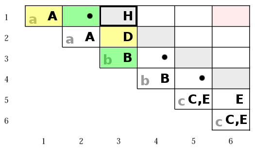 Grau markiert ist die Zeile auf der wir aktuell arbeiten. Nun suchen wir als erstes alle Produktionen, die in die Nonterminalzeichen zeigen. Bei "a" und "b" ist klar was zu tun ist. Bei "c" stoßen wir schon zum ersten mal auf eine Menge. Sowohl C als auch E zeigen auf "c".
