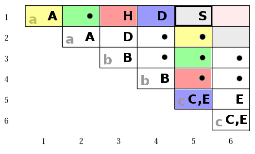 Wir bedienen uns dazu einer Dreieckstabelle, deren Felder für die Aufnahme der Mengen dienen. Im ersten Schritt stellen wir eine Tabelle auf die das Wort enthält. Die Bedingung ist erfüllt, wenn das das blass-rot markierte Feld rechts-oben ein S enthält.