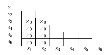 Für das Verfahren brauchen wir eine Tabelle bei dem alle Zustände miteinander verglichen werden. Da wir bereits wissen, dass S1 und S2 von S3, S4, S5, S6 unterscheidbar sind, können wir dies sofort mit dem Marker X0 eintragen.